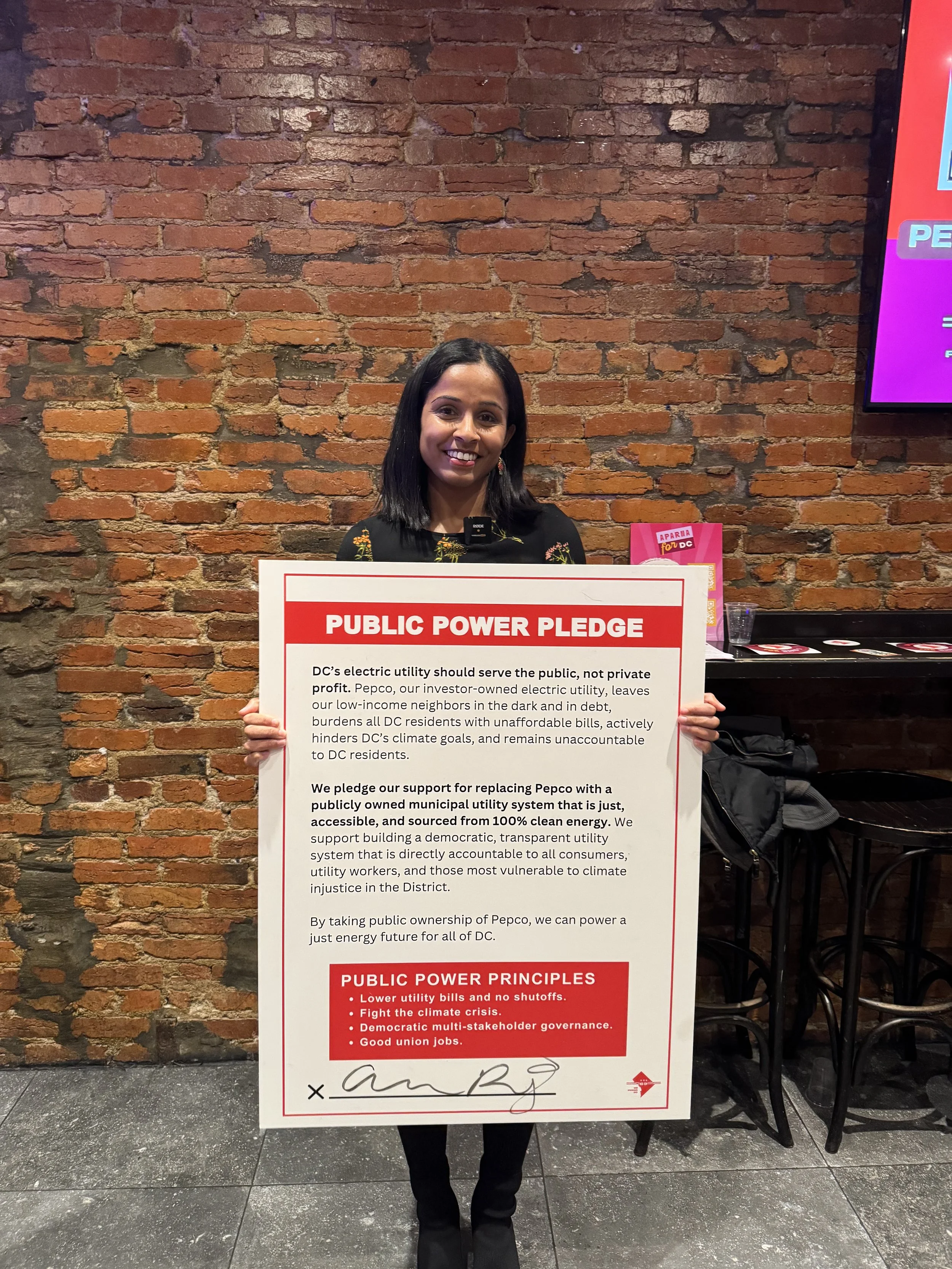 We Power DC is proud to announce DSA-endorsed Ward 1 candidate Aparna Raj has signed our Public Power Pledge. Raj is the second candidate behind Rep. Oye Owolewa (At-Large Candidate) to sign the Pledge in the 2026 cycle. Raj signed the pledge and spoke about her commitment to fighting a public power system in DC at a recent event.